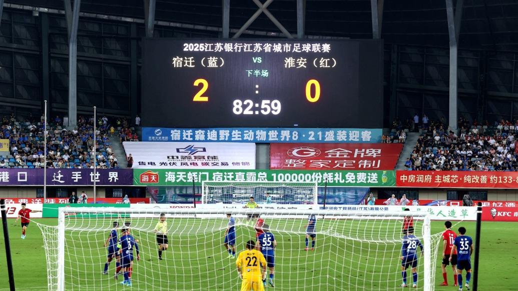 2025年8月30日,2025年江苏省城市足球联赛第十轮,宿迁队主场迎战淮安队。视觉中国 图